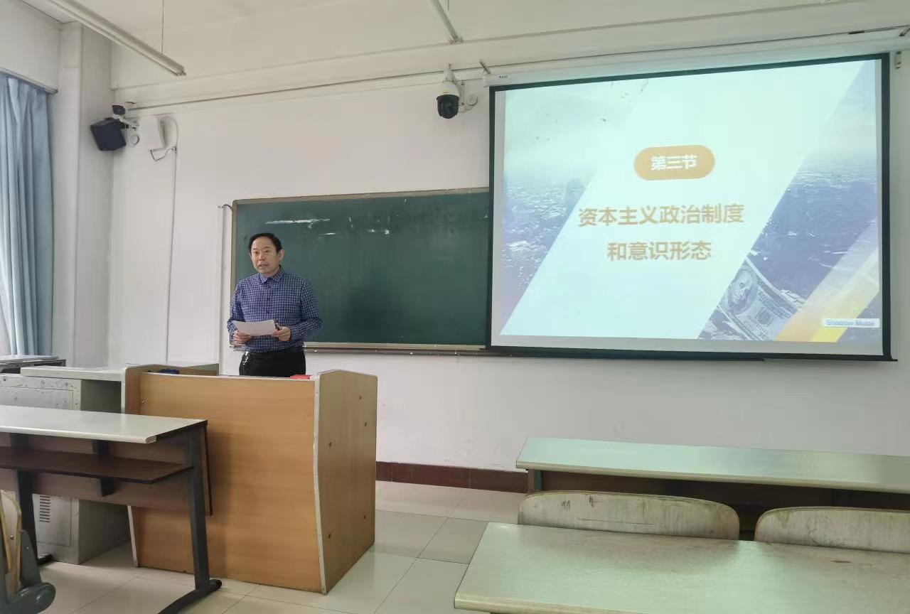 为了促进教学研究与改革,提供优秀教学示范,提高思想政治理论教研部整体理论水平,2022年11月23日下午,思政部组织全体教师学习《马克思主义原理》中资本主义政治制度和意识形态主题说课活动。本次教学活动由形势与政策教研室主任李海涛主讲。