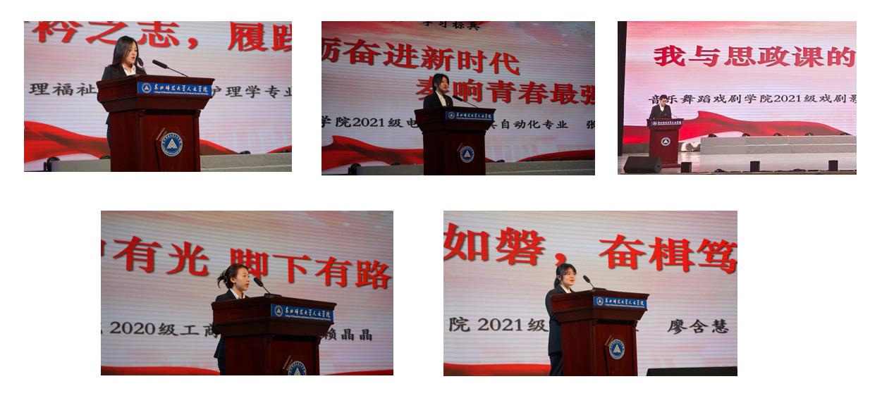 21级护理学专业员工郭继桐、21级电气工程及其自动化专业员工张雯喆、21级戏剧影视表演专业员工叶磊等3名同学作为学习标兵代表发言;20级工商管理专业员工赖晶晶、21级法学专业员工廖含慧等2名同学作为进步奖代表发言。各位代表分别从学习思政课的点滴以及在“思政课伴随我成长”理念的指导和影响下的感悟和收获做以分享。